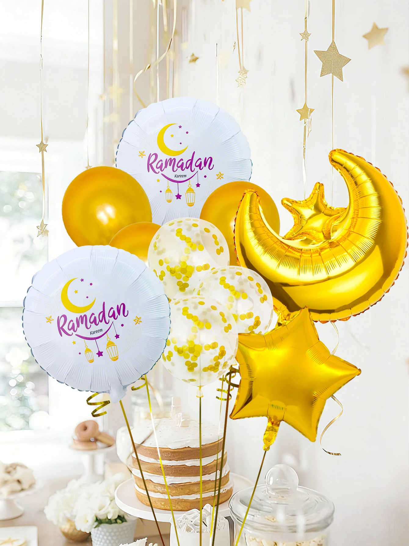 14pcs Gold Ramadan Balloon Set, including gold Ramadan balloons, star-shaped balloons, and latex balloons, suitable for Eid party, Eid home decoration, Ramadan Kareem