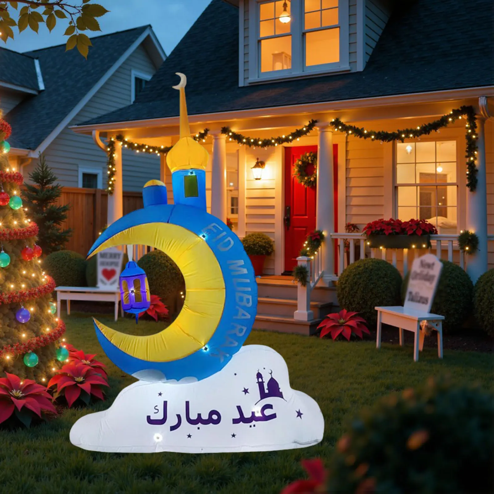 【Festive】: Illuminate your Ramadan celebrations with this glowing inflatable moon, featuring built in bright LED lights that instantly light up your yard and create a joyful atmosphere for family and guests