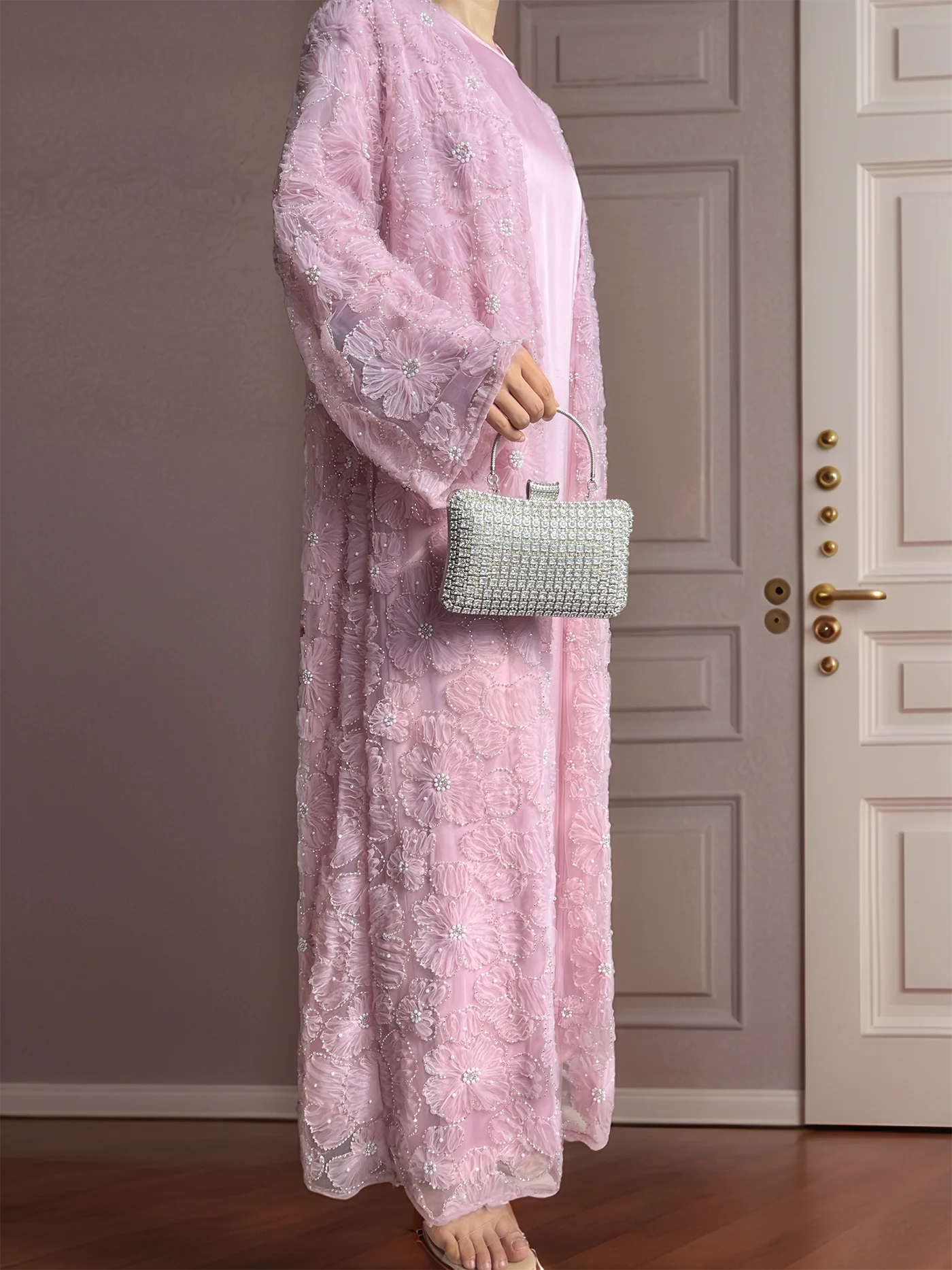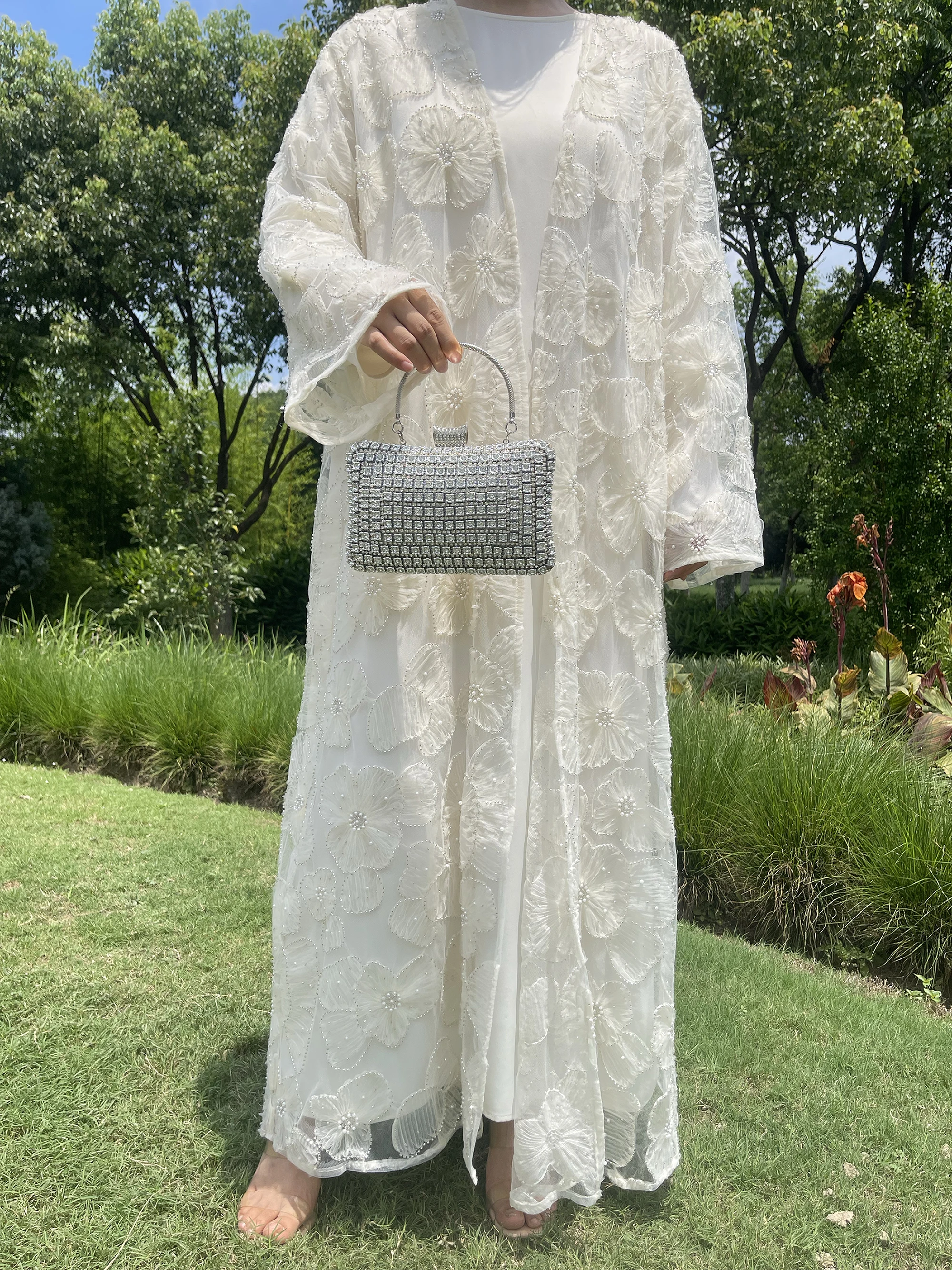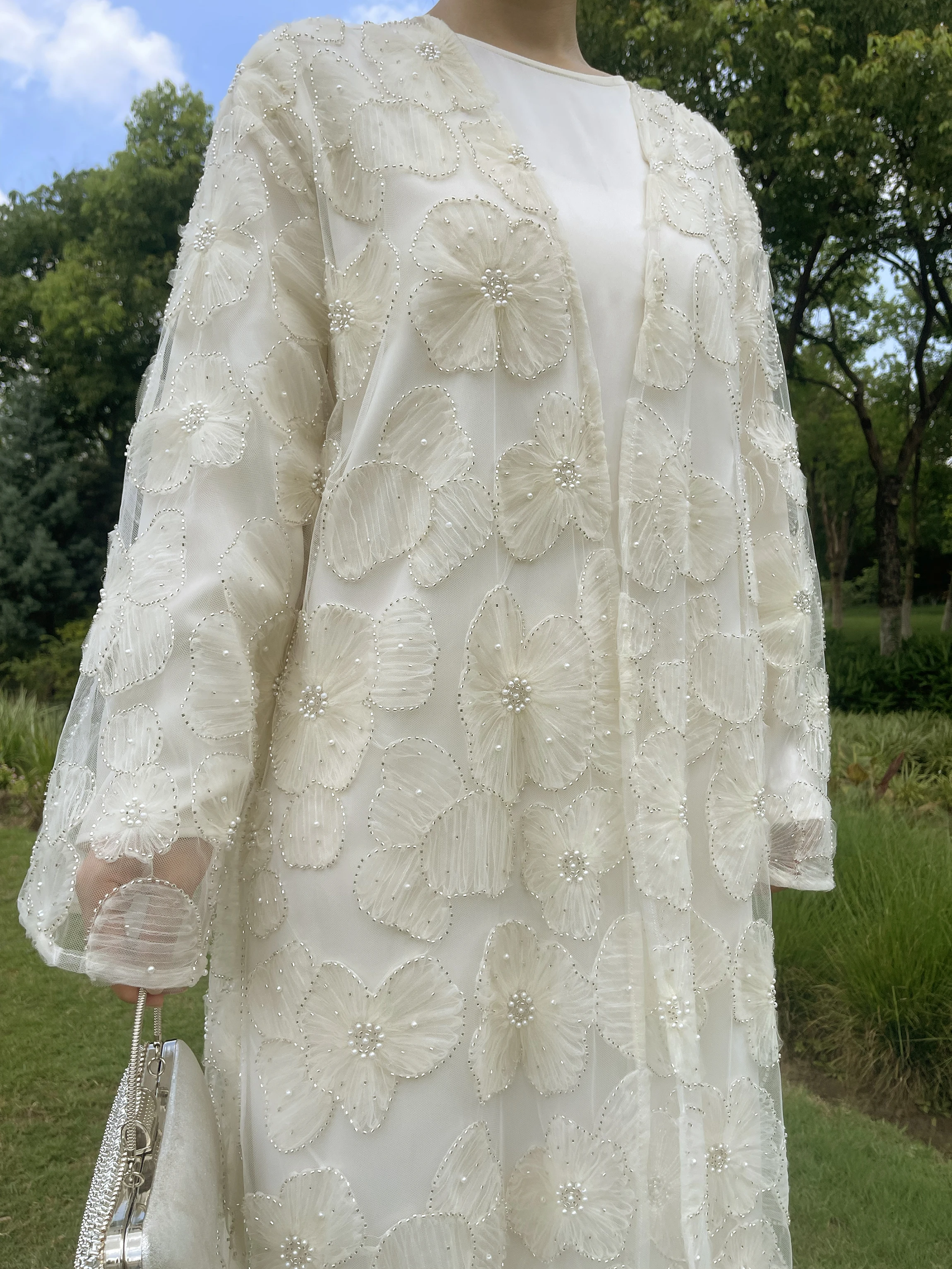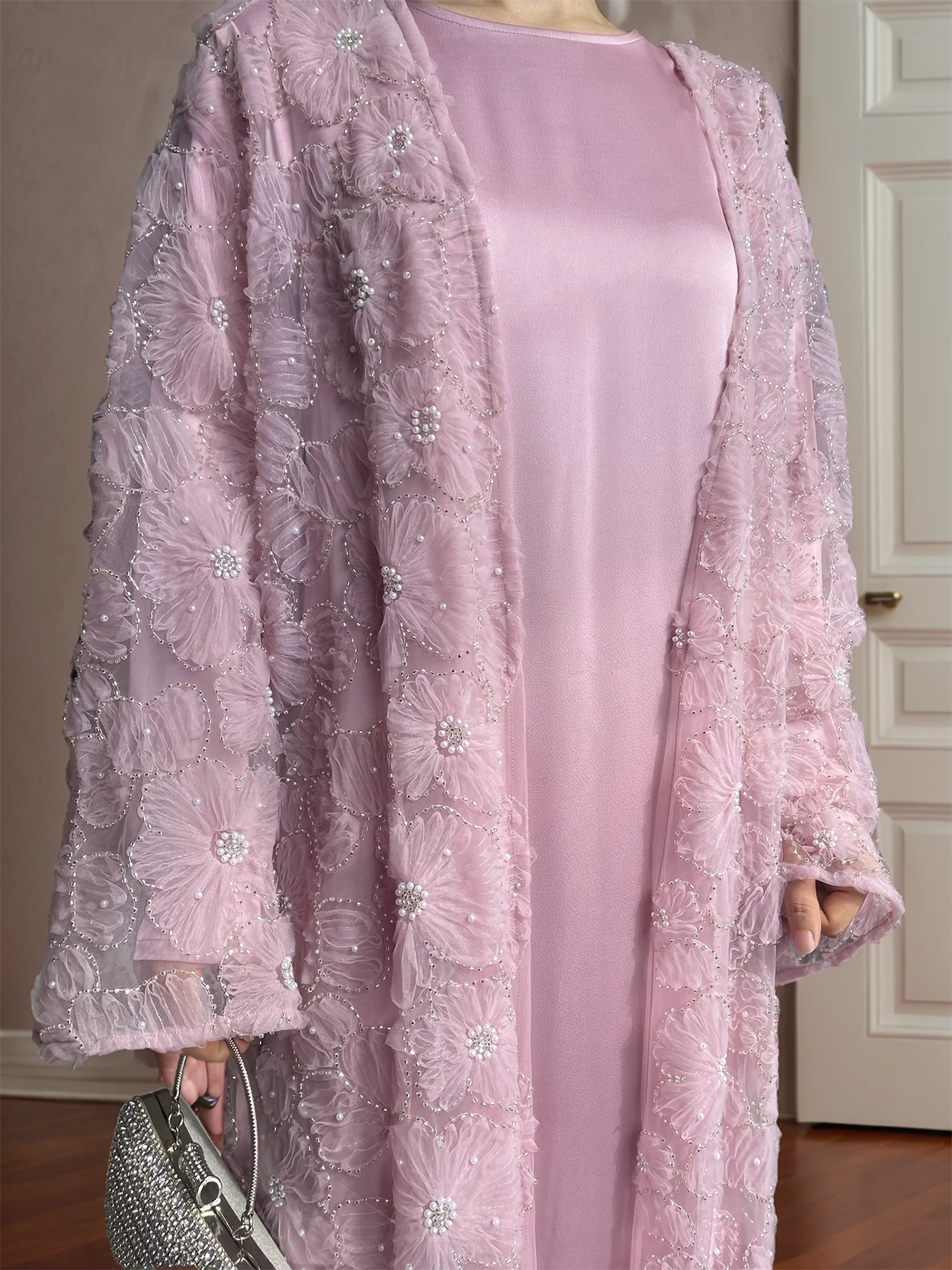 Muslim Women Two-piece Set Floral Beaded Abaya and Satin Inner Dress MSL881
