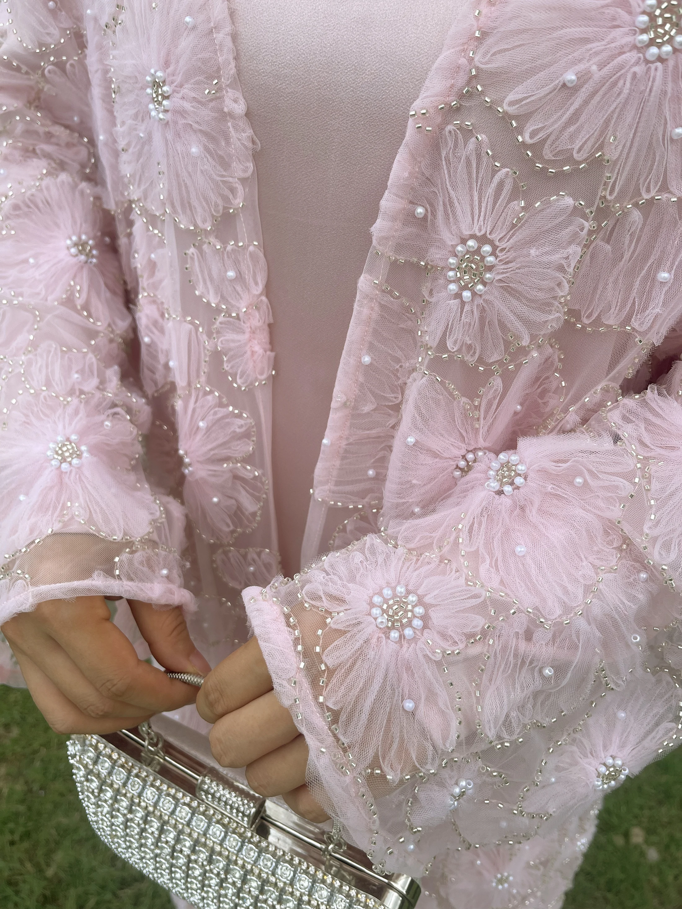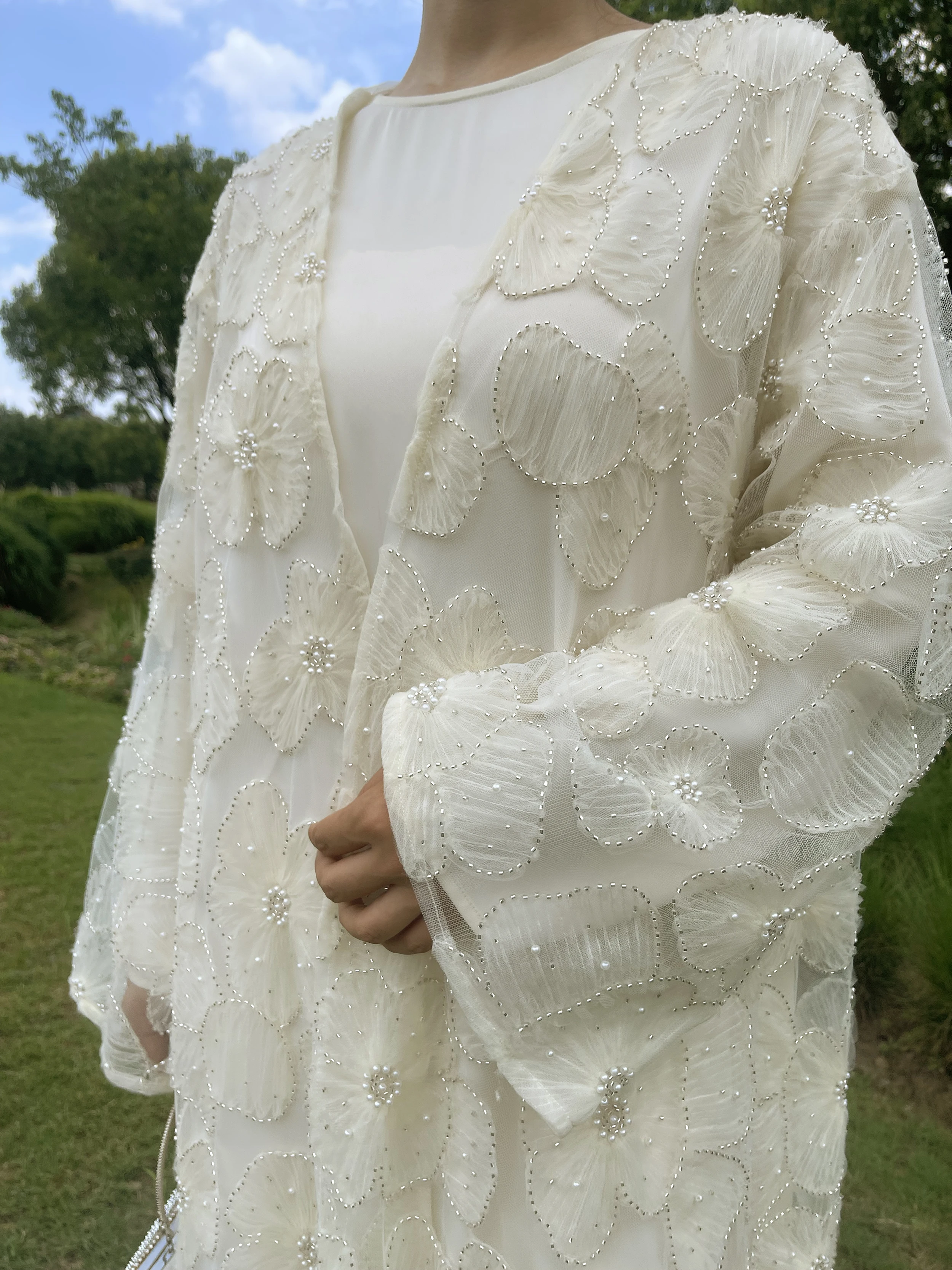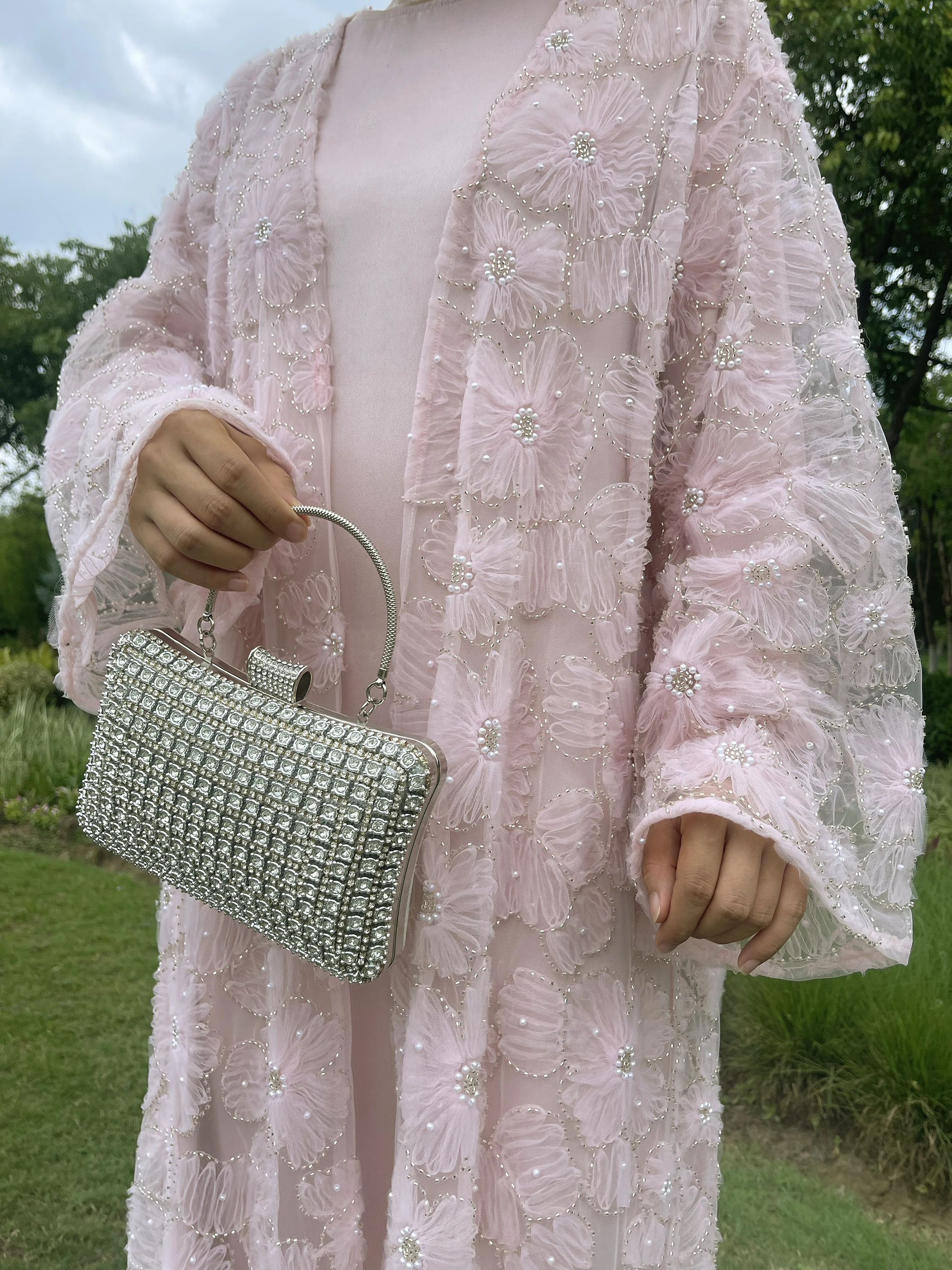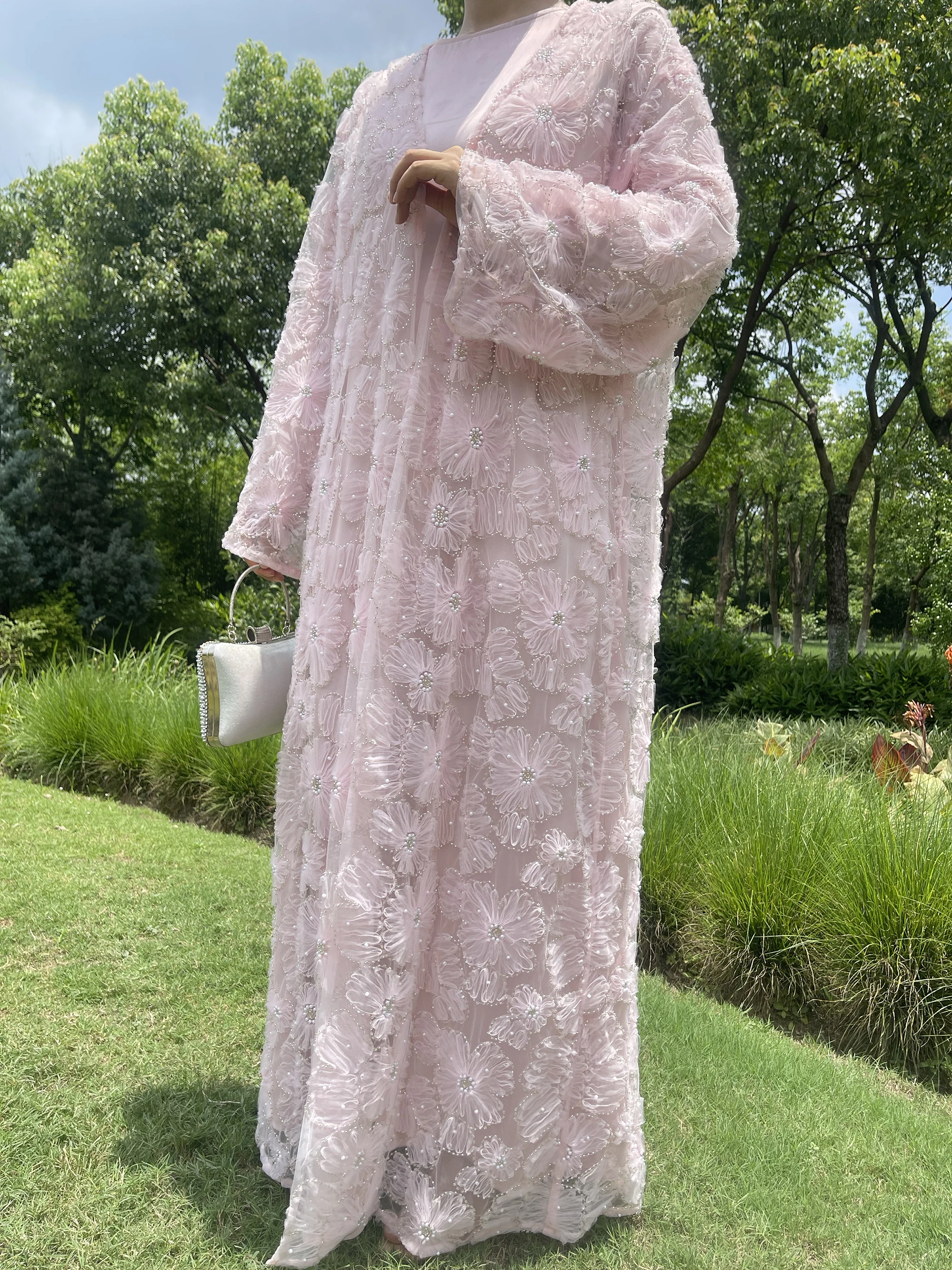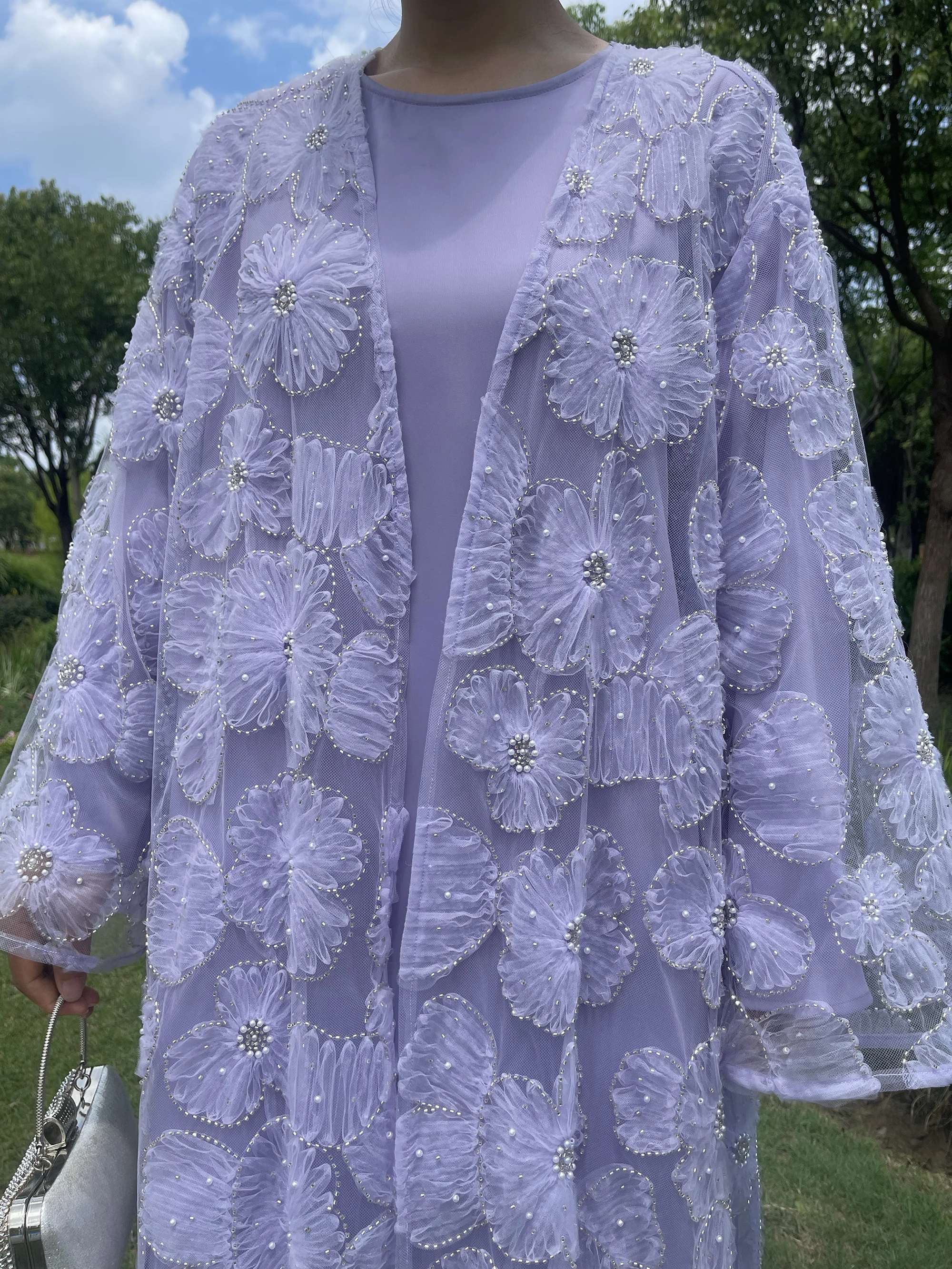 Muslim Women Two-piece Set Floral Beaded Abaya and Satin Inner Dress MSL881